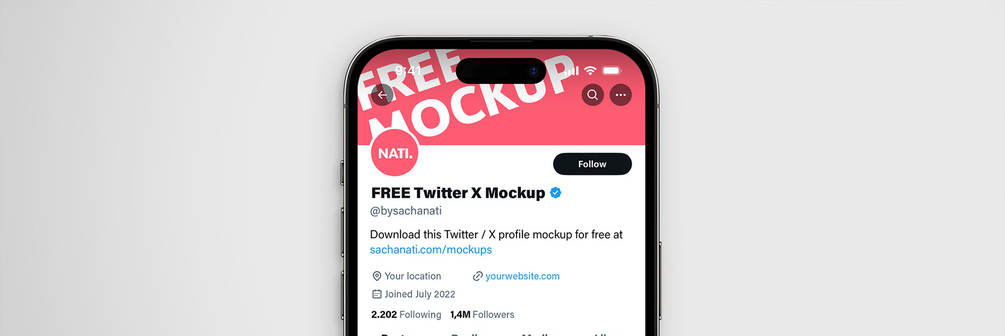 Download this mockup to display your Twitter / X profile with custom descriptions and posts displayed on an iPhone 15 Pro (or iPhone 14 Pro) for FREE! If you enjoy using it and you're looking for a higher resolution or you need to use it for commercial purposes, get the licensed version instead.